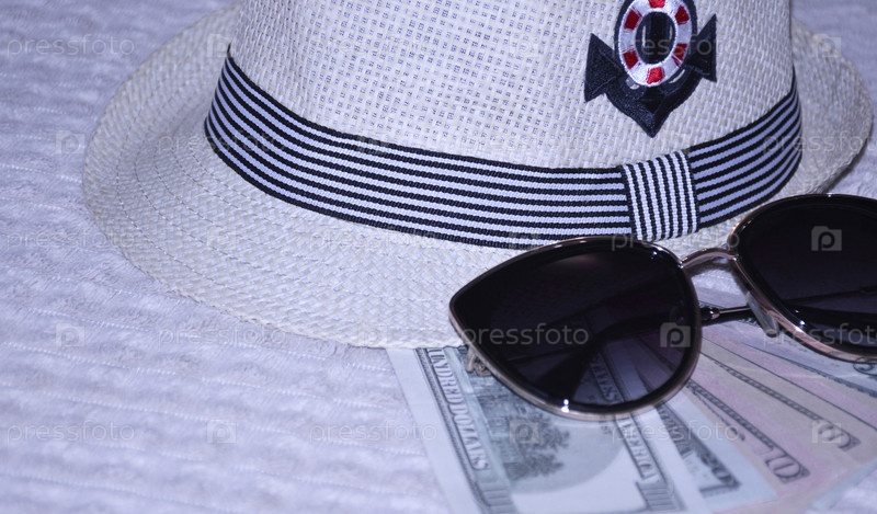 Соломенная шляпа, долларовые купюры и солнцезащитные очки. некоторые предметы гардероба и необходимые вещи во время летних каникул на открытом воздухе. защита головы и глаз от яркого палящего солнца