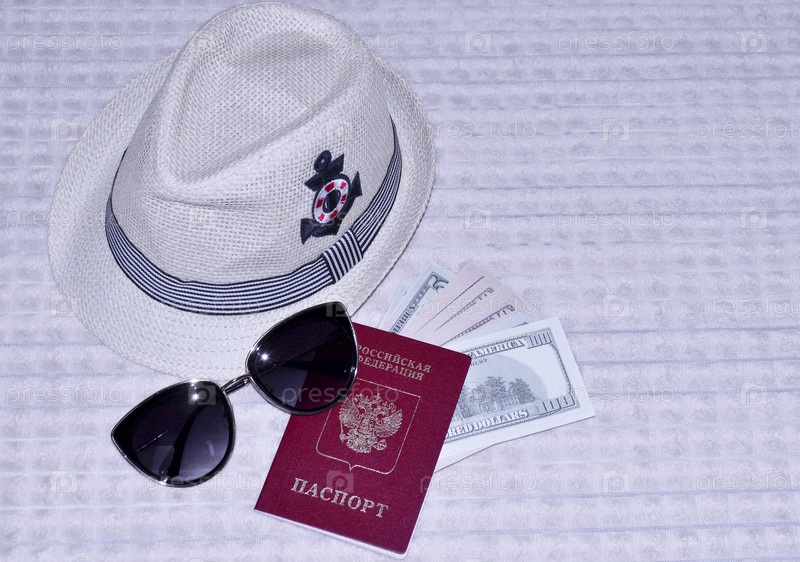 российский паспорт, соломенная шляпа, долларовые купюры и солнцезащитные очки. предметы гардероба и необходимые вещи во время летних каникул. защитите голову и глаза от яркого солнца