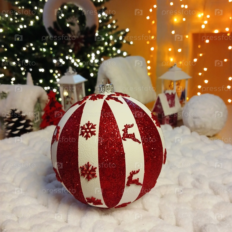 Большой красно-белый блестящий шар на фоне светящейся гирлянды и новогодних игрушек. Празднование Рождества и Нового года. Оформление дома и офиса, праздничное и веселое настроение