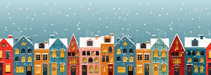 Очаровательная сцена зимней деревни с красочными домами, окруженными красивыми снежинками