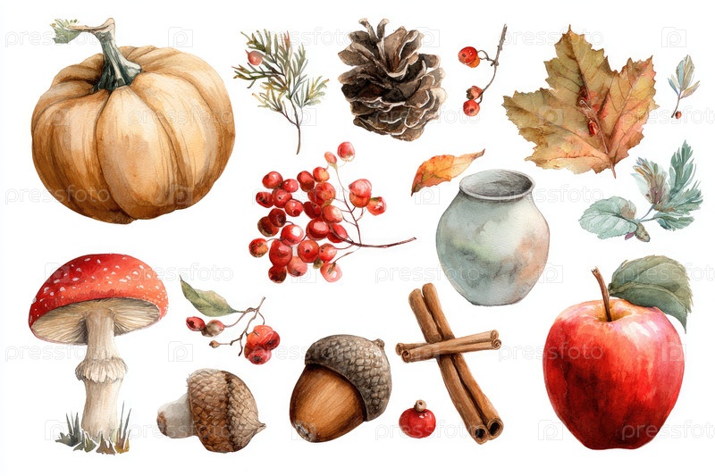 Осенний акварельный набор с тыквой, грибами, яблоками и желудьми