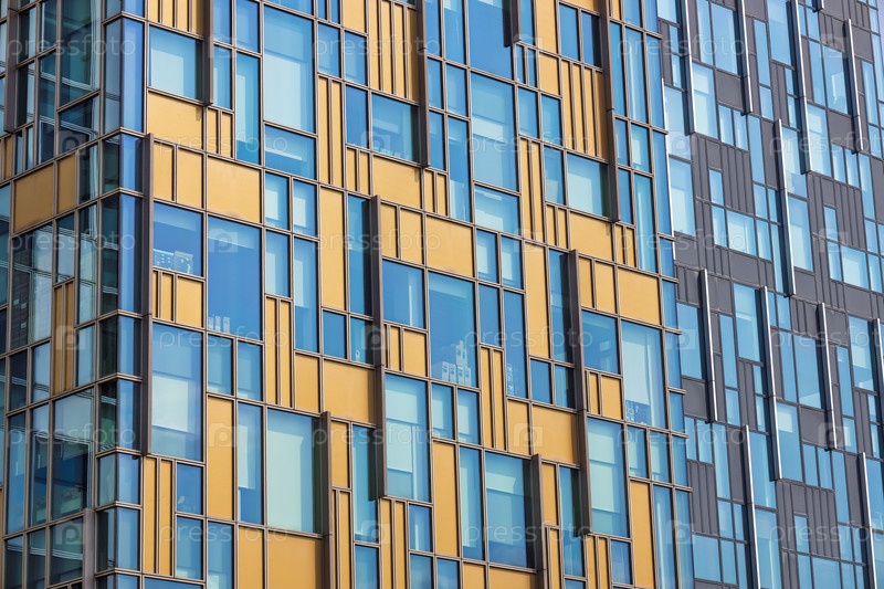 Закройте современный фасад квартиры голубым стеклом и золотыми металлическими панелями, образуя яркий геометрический рисунок окон в городской обстановке