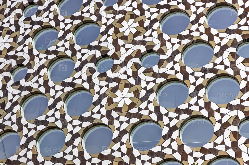 Закройте перфорированный экран с исламскими звездными кругами, решеткой mashrabiya, которая оттеняет окна и обогащает современный фасад декоративной текстурой