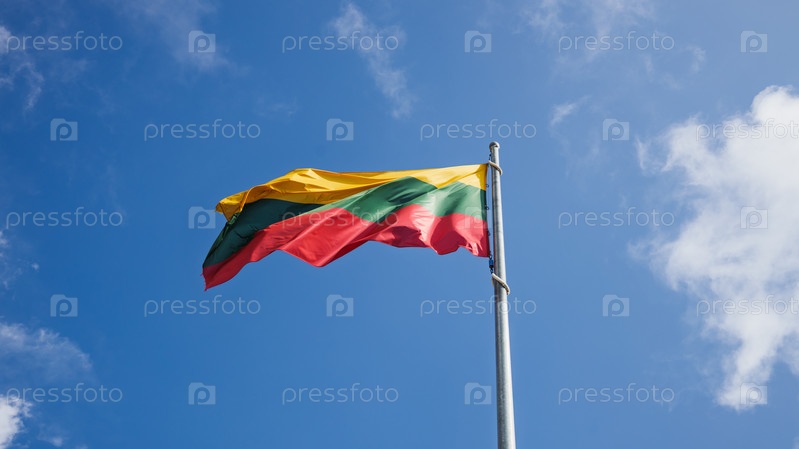 Литовский флаг желтого, зеленого и красного трехцветного цвета, размахивающийся на высоком полюсе против ярко-синего неба с облаками