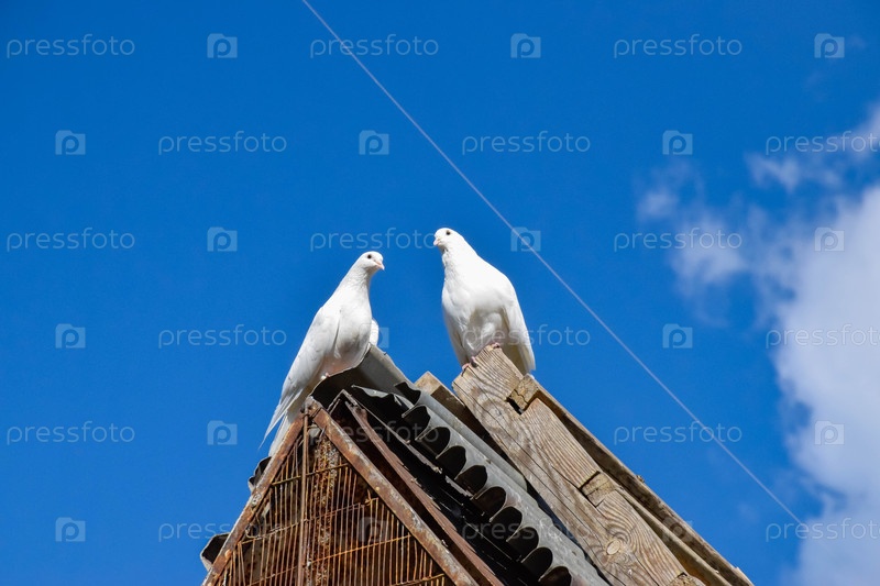 Пара белых голубей сидит на крыше против синего неба