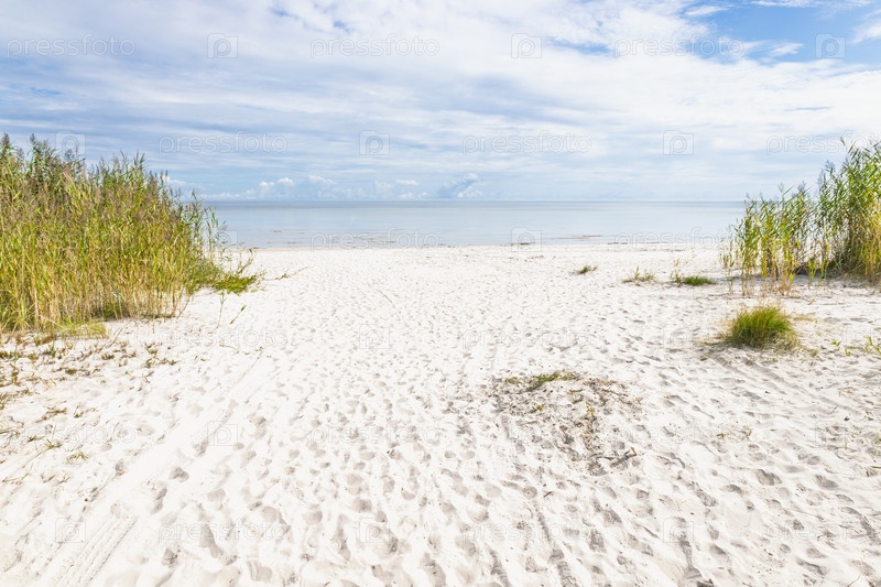 Спокойный пляж на Балтийском море с ярко-белым песком, дюнными травами и спокойной бирюзовой водой под мягким голубым небом