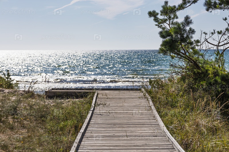 Солнечная пляжная сцена Балтийского моря с деревянной набережной через дюнную траву до искрящихся волн и широкого горизонта