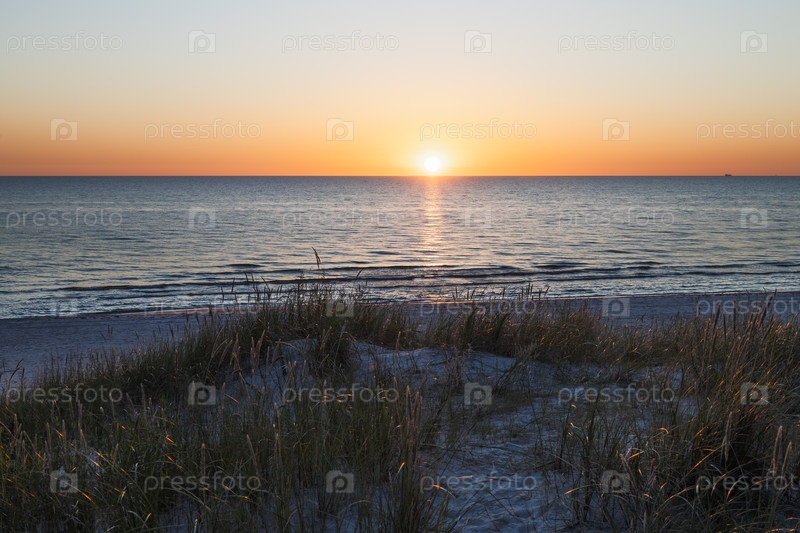 Теплый закат над Балтийским морем с спокойными волнами, песчаным берегом и дюнной травой