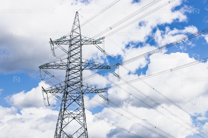 Стальная высоковольтная передающая башня с линиями электропередач под голубыми облаками
