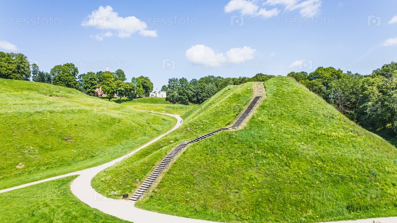 Живописный балтийский пейзаж археологического памятника Кернаве и зеленых хребтов Хиллфорта, Литва