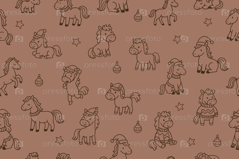 Бесшовный рисунок милых пони и лошадей в стиле doodle для китайского Нового года 2026 г. Руки черных пони и лошадей на коричневом фоне