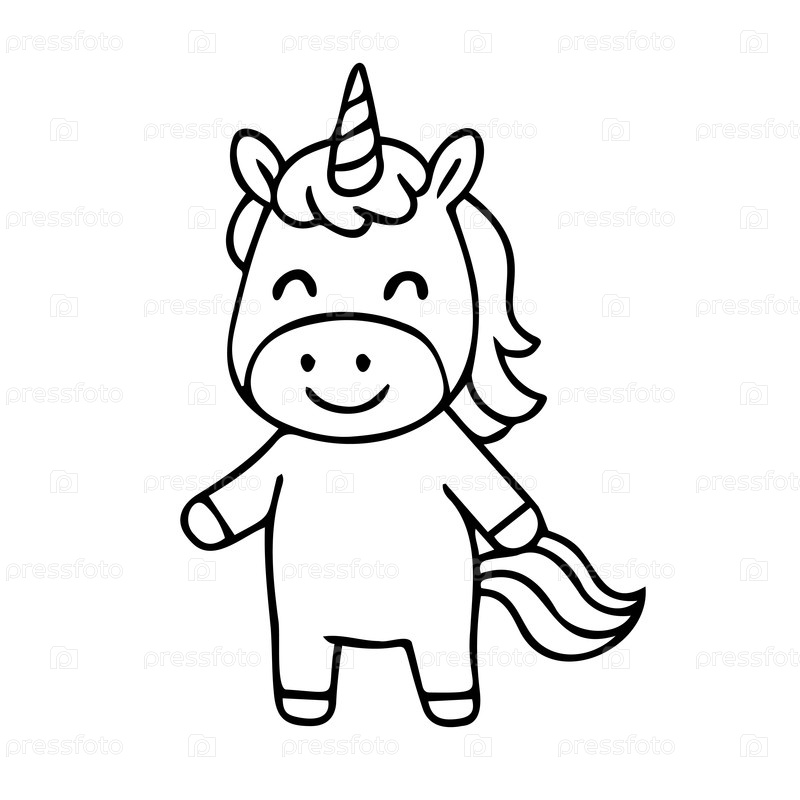 Черно-белая иллюстрация милого улыбающегося единорога.Простой и очаровательный дизайн идеально подходит для цветных книг, детских материалов и проектов