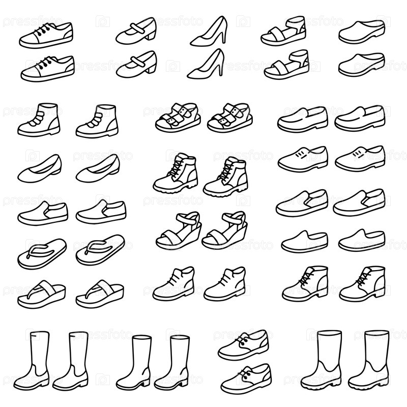 Иллюстрация с различными дизайнами обуви, включая разные модели кроссовки, сандалии, сапоги и каблуки на высоких каблуках. Идеально подходит для моды, стиля и темы обуви