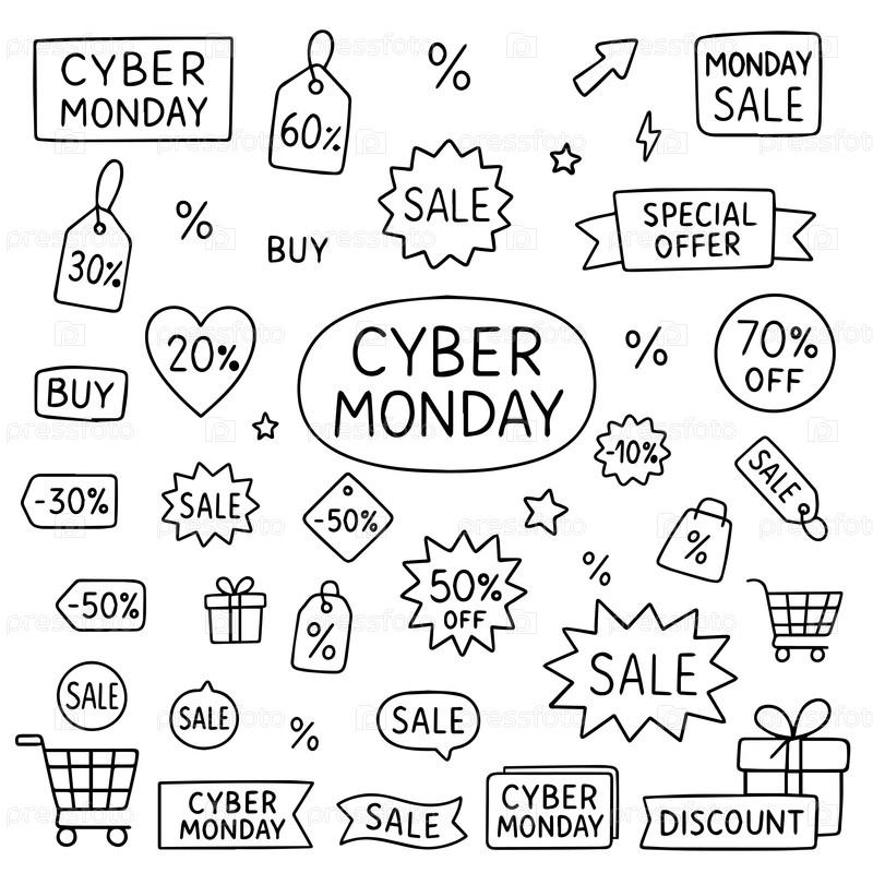 Киберпонедельник иллюстрация с различными торговыми тегами и скидками. включает интерес, специальные предложения и значки покупок идеально подходят для маркетинговых материалов и онлайн-промоций