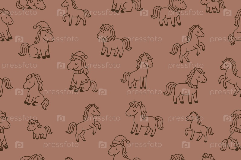 Бесшовный рисунок в стиле doodle милых лошадей для традиционного китайского Нового года 2026 г. Рука черных коней на коричневом фоне