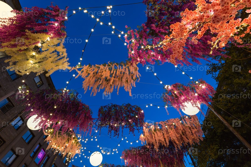 Нижний вид гирлянд и искусственных цветов 'Летом', установленных на вечернем небе на центральной пешеходной улице в Новосибирске, Россия во время фестиваля цветков 'Сезоны'