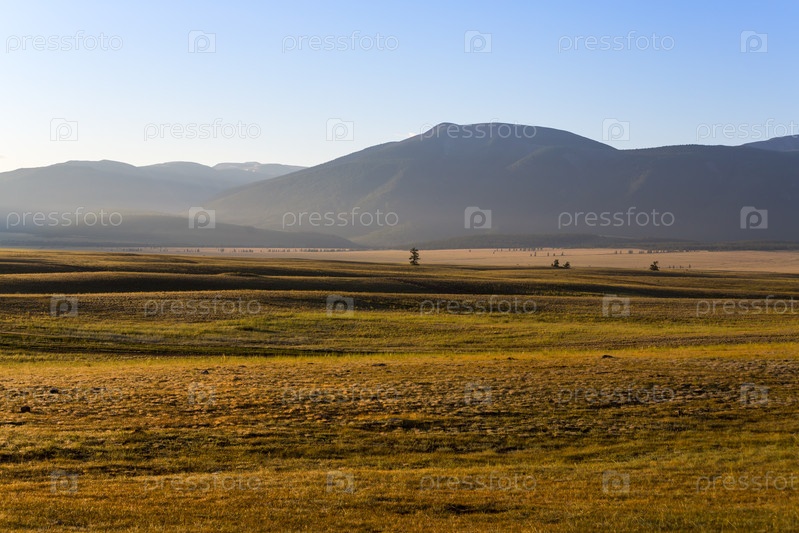 Прекрасный пейзаж гор Алтая на рассвете.Первые лучи солнца освещают горную долину и склоны