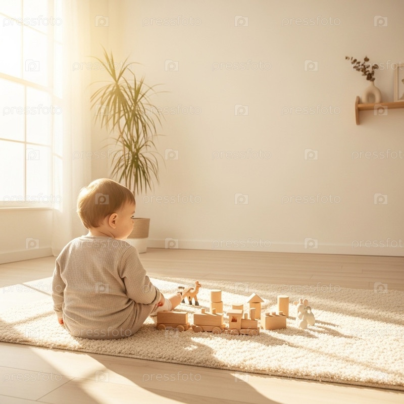 Первые открытия: Дети играют с деревянными игрушками в солнечной комнате