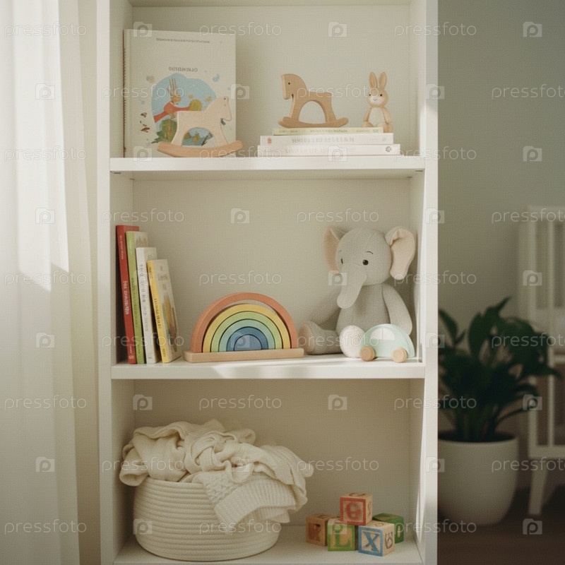 Уют и развитие: полка с детскими игрушками и книгами в светлой комнате