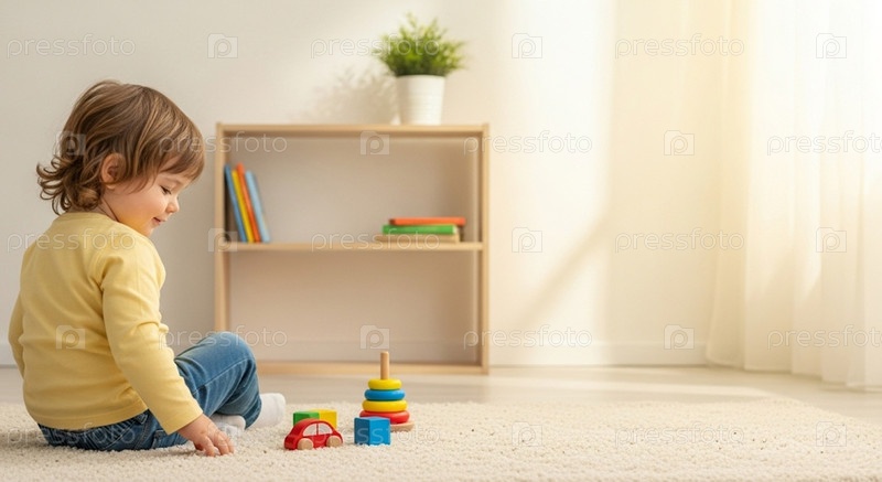 Счастливый ребенок играет на ковре