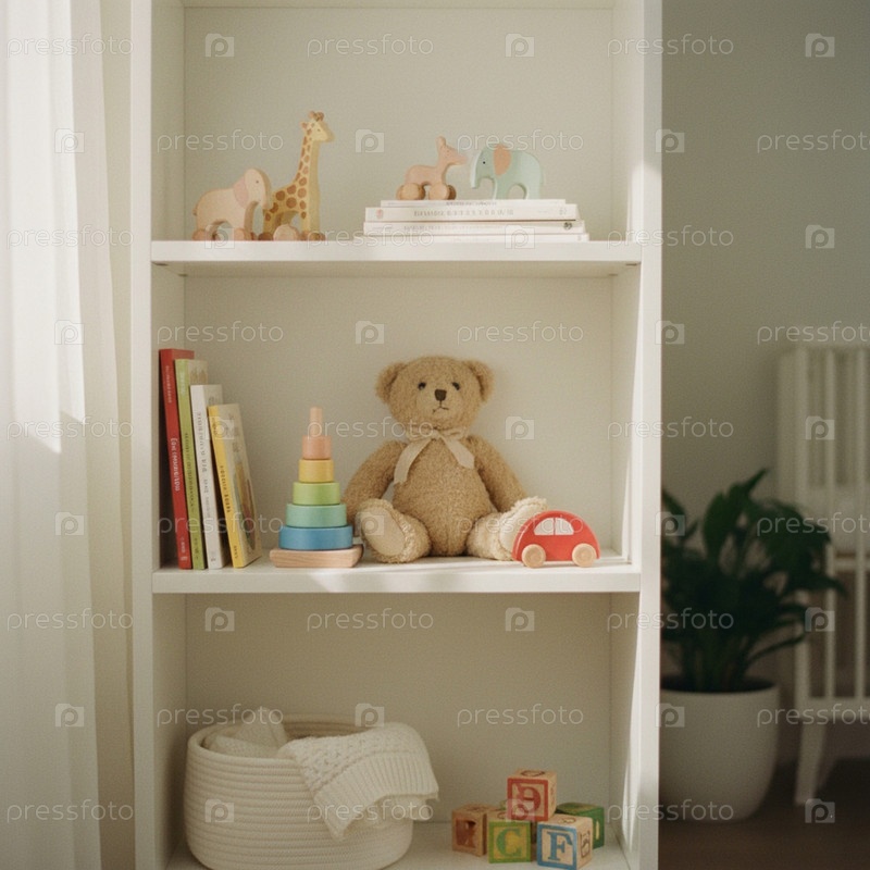 Детские игрушки на полке: медведь, кубики и деревянные фигуры