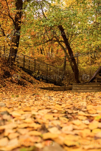 Деревянная лестница в осеннем лесу с упавшими листьями на земле