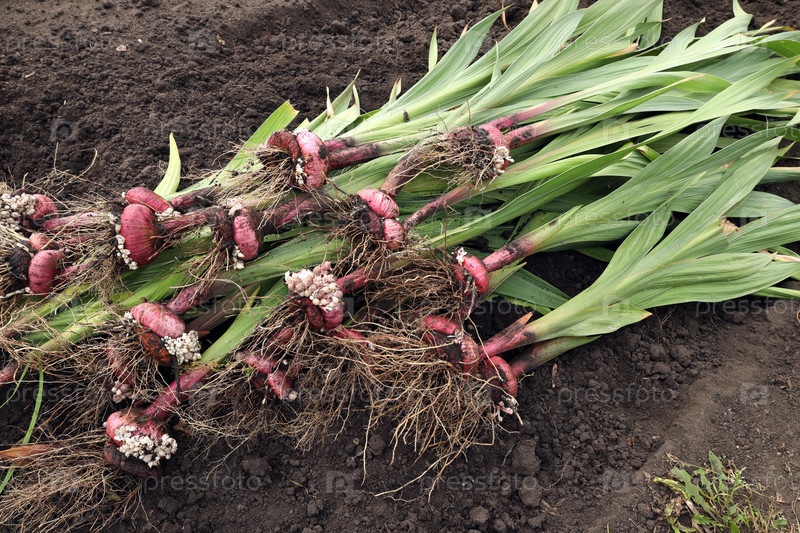Раскопанные луковицы гладиоли с зелеными стеблями лежат на земле