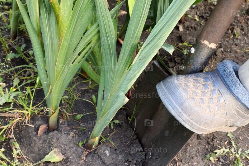 Садовник выкапывает гладиолусы осенью лопатой