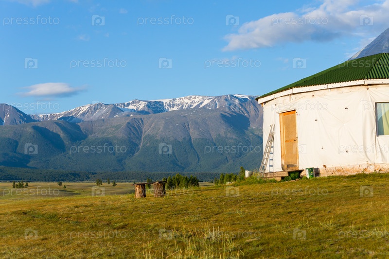 Традиционная юрта Алтая на фоне горного хребта на рассвете Летняя поездка в высокогорье Кочевой образ жизни Национальный древний дом народов Азии