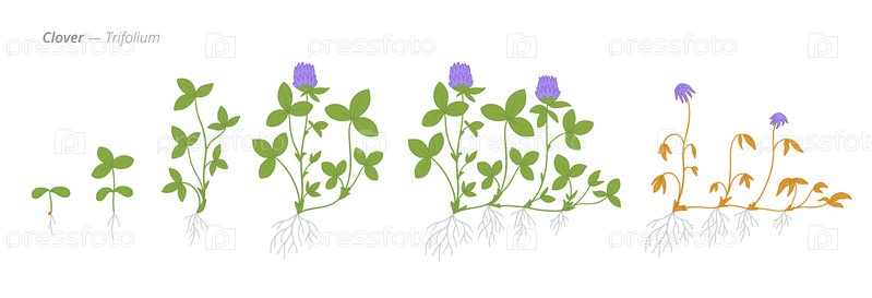 Иллюстрация показывает растения клевера на разных стадиях роста, подчеркивая семена, побеги, зрелые растения и сухие вершины, полезные для садоводства и сельского хозяйства