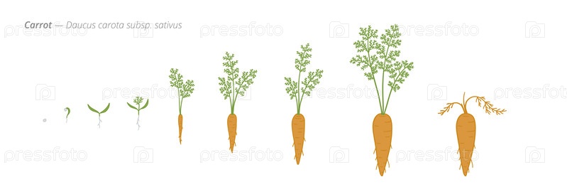 Иллюстрация, показывающая стадии роста моркови, от семян и побегов до зрелых готовых к культивированию растений, подчеркивая ключевые фазы роста