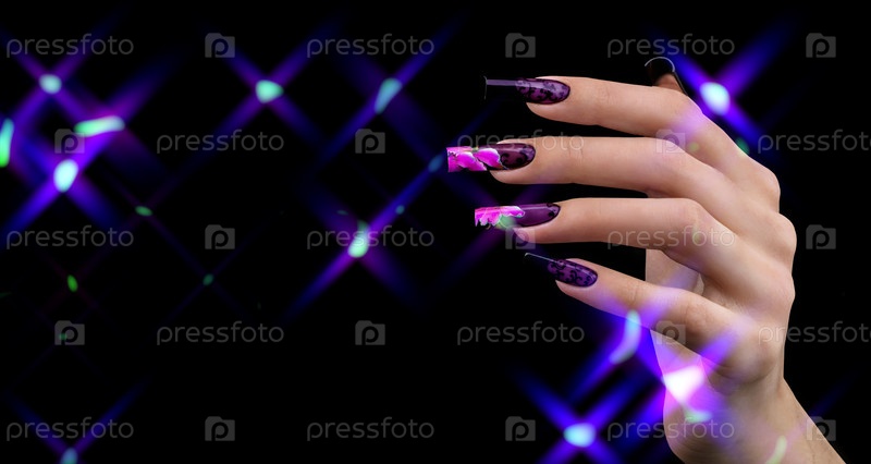 Рука с красивым маникюром в волшебных отражениях света на черном фоне. дизайн ногтей. расширенные ногти