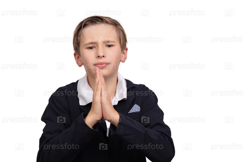 Портрет мальчика, просящего что-то на белом фоне в крупном плане