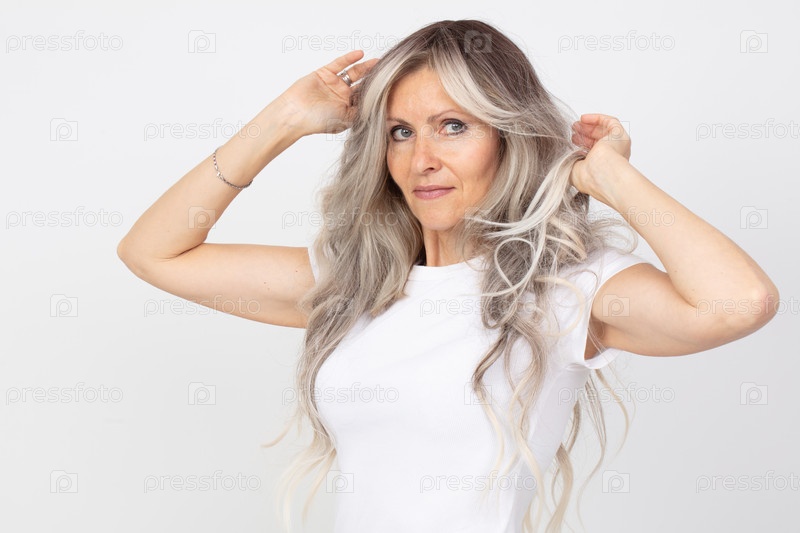 Пожилая женщина с седыми волосами красива и счастлива