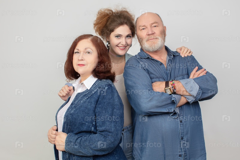 Красивая пара пожилых людей и молодая девушка обнимаются, глядя в камеру