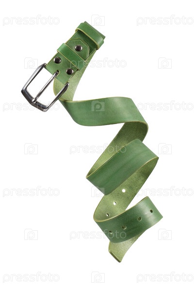 Часть кожаного ремня с металлической застежкой вблизи изолирована на белом фоне