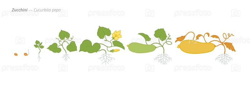Растущие стадии кабачка, иллюстрирующие семена, побеги, цветение и зрелые плоды, подчеркивая важные сельскохозяйственные циклы