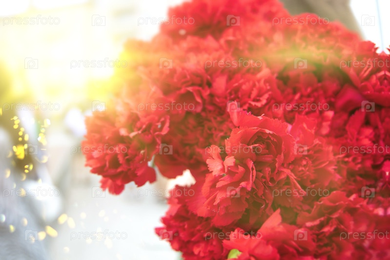 Красные пушистые гвоздики цветут на абстрактном сером фоне
