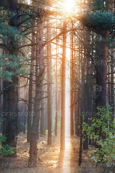 Сосновый лес в лучах желтого солнца и тумана сфотографирован вертикально
