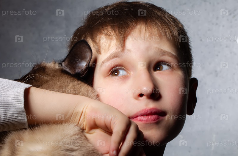 Маленький мальчик обнял кошку