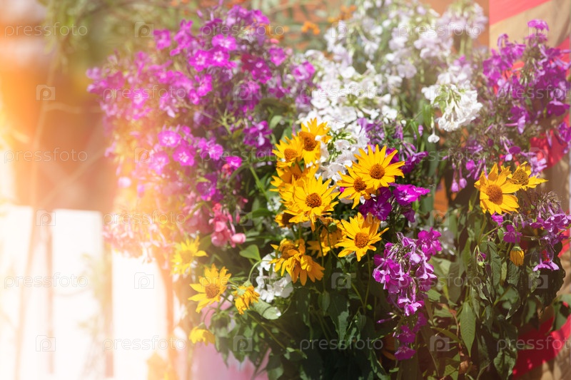 Цветочный фон букета хризантемов и петунии в желтом тумане