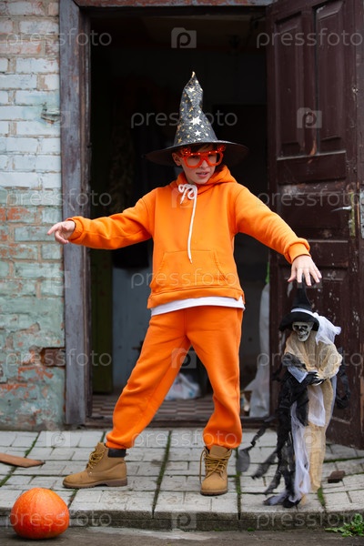 Ребенок в оранжевом костюме и волшебной шляпе на Хэллоуин.Мальчик держит скелет на вечеринке