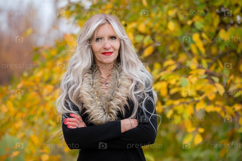 Портрет красивой пожилой женщины с седыми волосами на осеннем фоне
