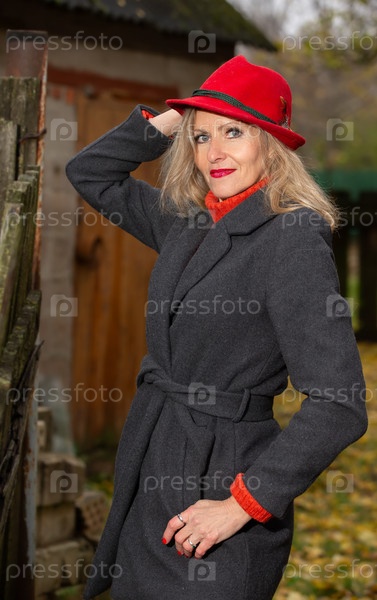 Красивая блондинка пожилой женщины в экстравагантной красной шляпе и сером пальто