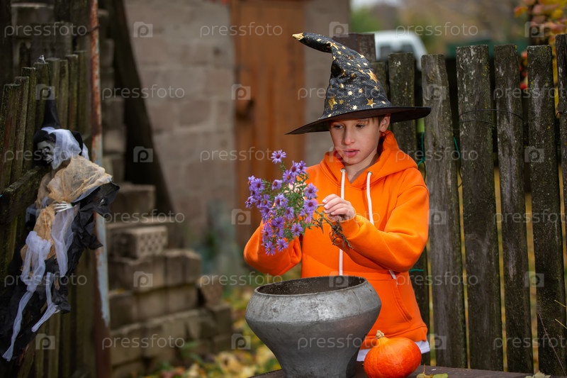 Детка-волшебник на вечеринке Хэллоуина с колдовской шляпой перед старым жутким домом