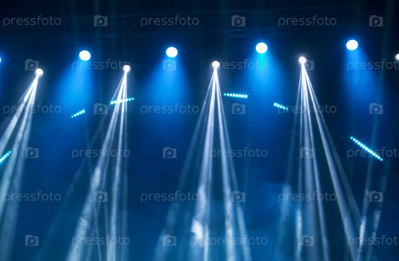 Лучи белого света от светофоров сцены на голубом задымленном фоне.Начало концерта или шоу
