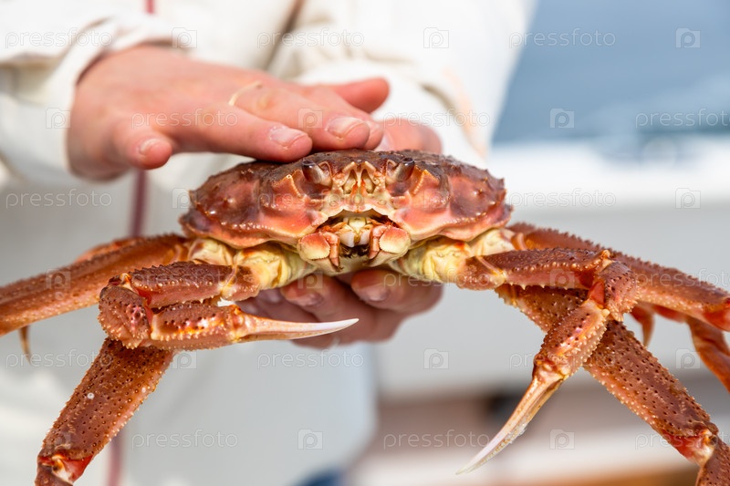 Свеже пойманный камчатский краб в близких руках