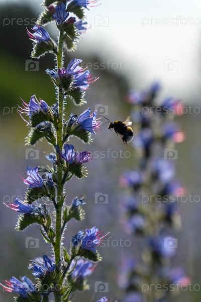 Медоносная пчела опыляет ярко-фиолетовые лупинские цветы в теплом летнем вечернем свете, собирая нектар для получения меда