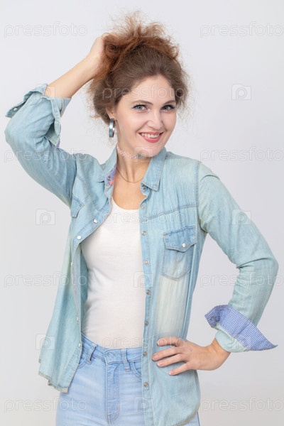 Вертикальный портрет счастливой девушки в джинсовой рубашке