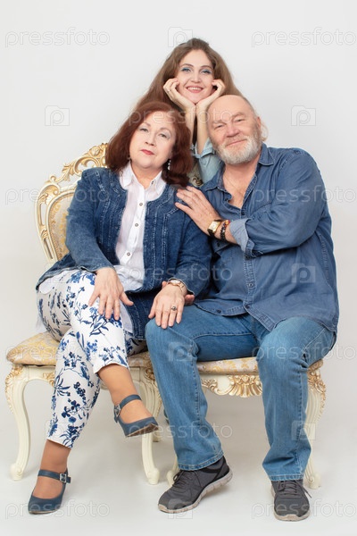 Семейный портрет взрослой дочери и пожилых родителей на сером фоне